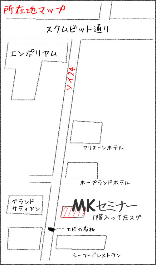MKセミナーの教室は、スクムビットsoi24を入って、350メートル程。シーフードレストランの大きなエビの看板の手前、グランドサティアン向かいにあります。